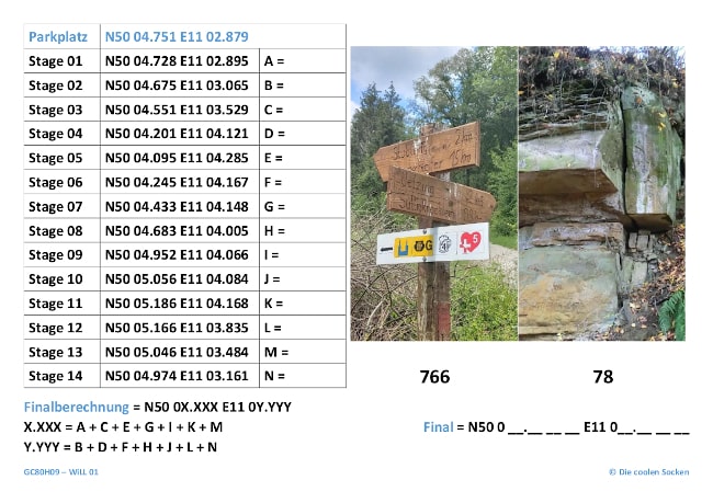 Druckt euch vor dem Wandern das Listing mit den Hinweisen zu den Wegpunkten und den Laufzettel aus (idealerweise farbig, A4 quer). Hier findet ihr auch nochmals alle Stages gelistet. Schaut euch an den vorgegebenen Koordinaten gut um und ordnet den Zahlenwert des entdeckten Objekts dem jeweiligen Buchstaben zu. So könnt ihr am Schluss das Final berechnen.