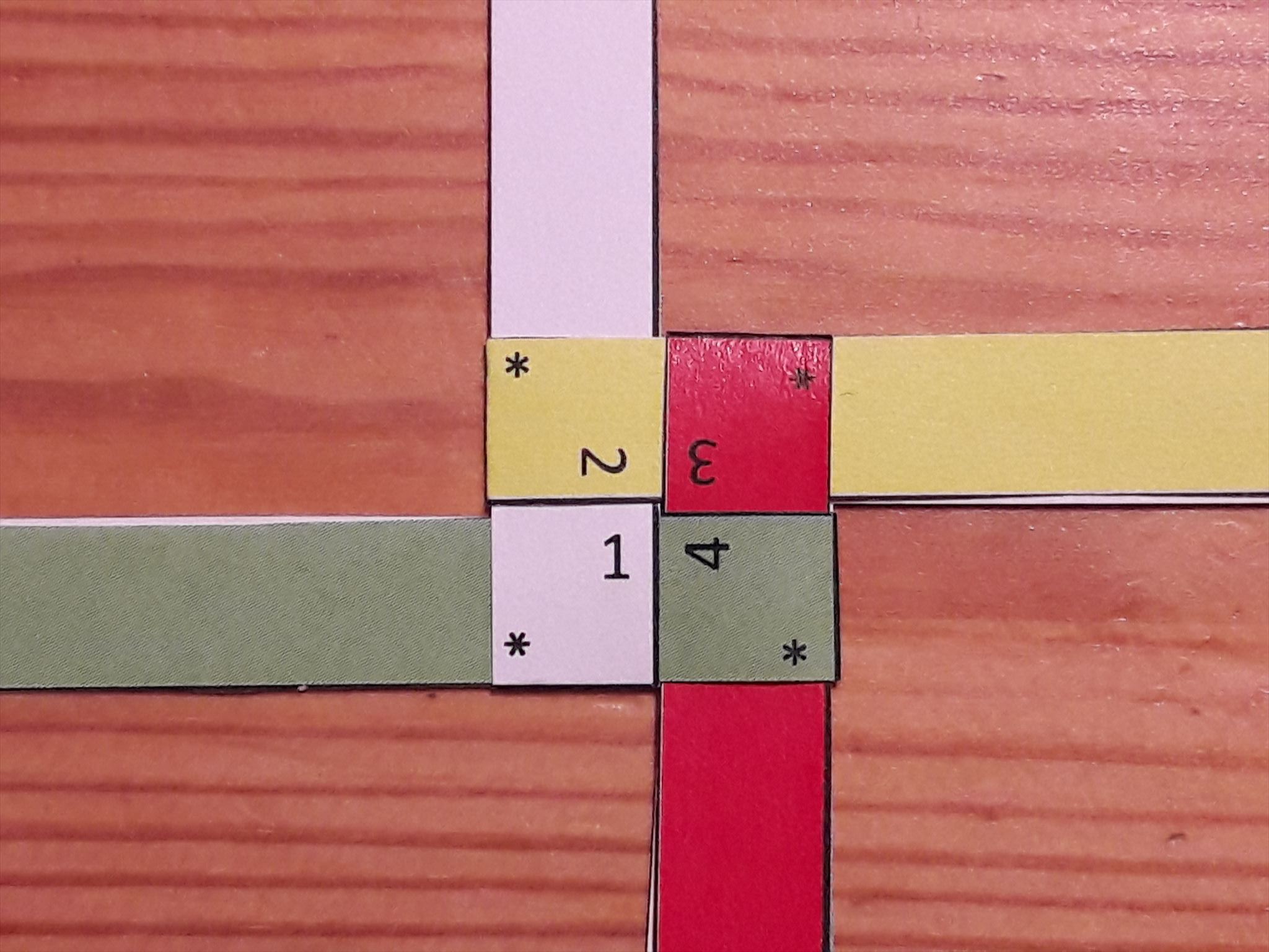 Druckt euch die (Achtung: Der folgende Link startet den Download einer Datei mit weiteren Details, die zum Finden des Geocaches benötigt werden. Als der Cachebesitzer versichere ich, dass diese Datei ungefährlich ist. Die Datei und ihr Inhalt sind nicht von Groundspeak oder einem Geocache Reviewer auf schädlichen Inhalt überprüft worden und die Datei wird auf eigene Gefahr heruntergeladen [https://magentacloud.de/s/d6jQHHHER3GJTy8]) →VORLAGE aus und beginnt. Dazu müsst ihr das Blatt an den gestrichelten Linien falten und auf einander kleben. Schneidet die Streifen aus und legt sie Euch wie im Bild unten zurecht. Dann kann es auch schon losgehen! Aber was? Das müsst ihr schon selbst herausfinden.