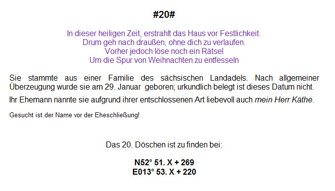 Hier ist nun Schluss. Der Cacheadventskalender 2018 wird nun geschlossen. Daher ist " Auf der Suche nach Weihnachten #20#" nun nicht mehr findbar, denn der Cachebehälter wurde entfernt.