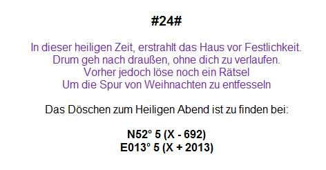 Hier ist nun Schluss. Der Cacheadventskalender 2018 wird nun geschlossen. Daher ist " Auf der Suche nach Weihnachten #24#" nun nicht mehr findbar, denn der Cachebehälter wurde entfernt.