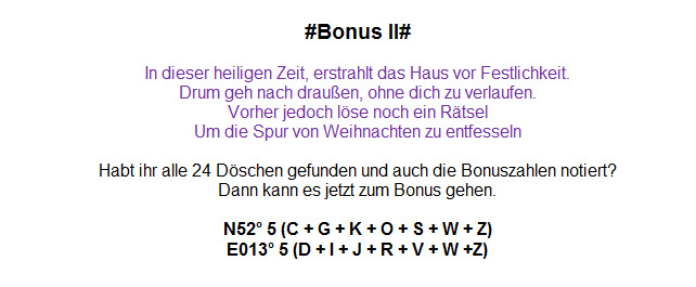 Hier ist nun Schluss. Der Cacheadventskalender 2018 wird nun geschlossen. Daher ist " Auf der Suche nach Weihnachten #Bonus II#" nun nicht mehr findbar, denn der Cachebehälter wurde entfernt.