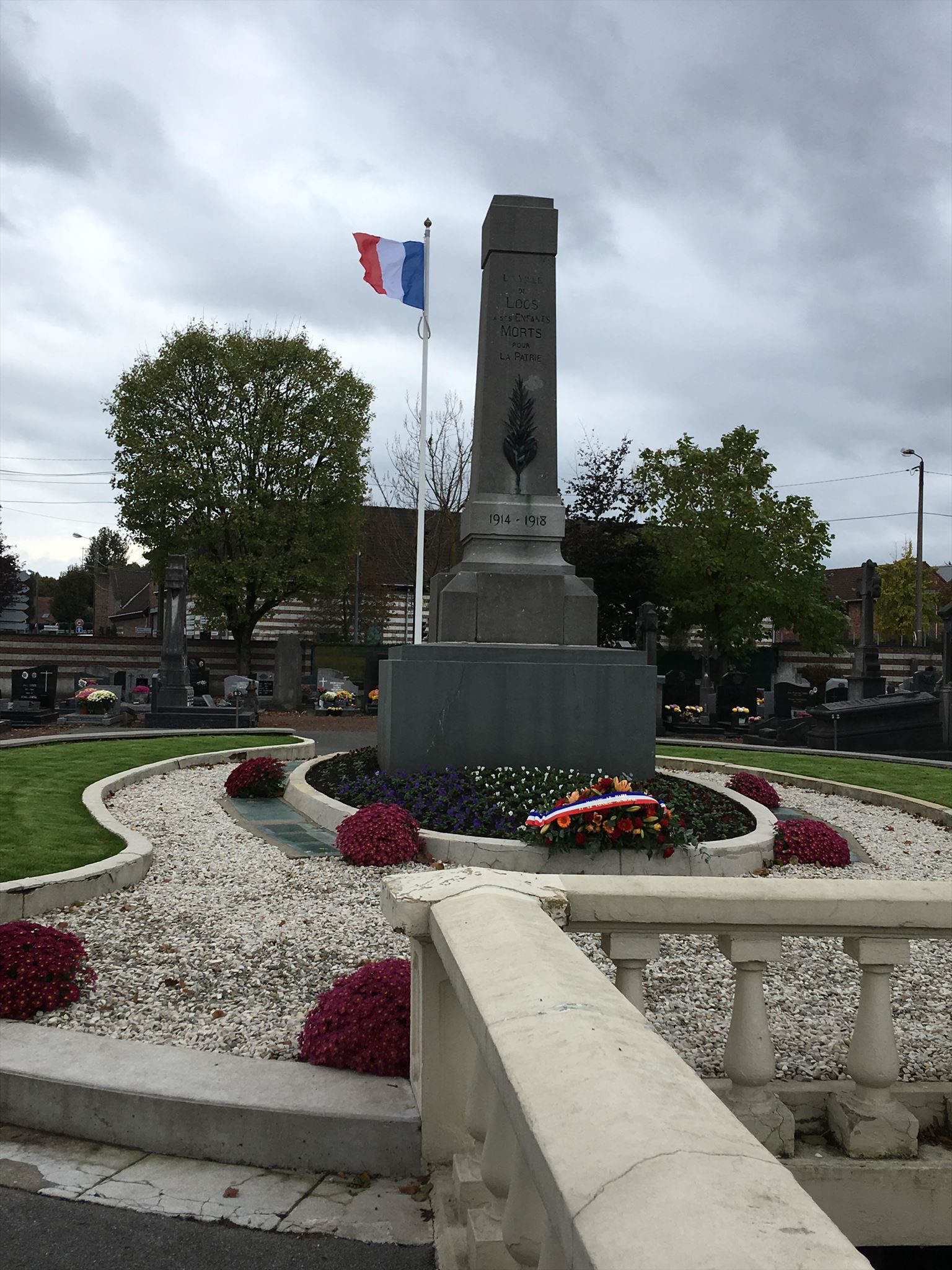Vous êtes ici à l'arrière du cimetière Leclerc dans lequel vous pourrez trouver un monument et une crypte érigés en honneur des soldats décédés lors de la première guerre mondiale. Vous pourrez également voir un autre monument, plus proche de l'entrée, en mémoire des soldats décédés lors de la seconde guerre mondiale.