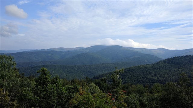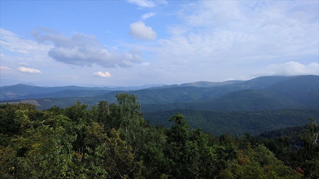 Vidno z tadeto hlavný hrebeň Volovských vrchov, cca. uprostred sa nachádza Skalisko (1293 m n. m.).