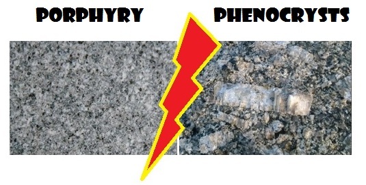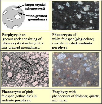 The term 'porphyry' describes a specific texture found in igneous rocks, where they contain larger crystals of certain minerals (especially feldspar or quartz), these being surrounded by a composite of minerals that have a much smaller sized crystal. The larger crystals are called 'phenocrysts' or 'sprinkle grains'. Porphyritic structures are characteristic of lavas and the igneous rocks found in dykes and sills. The phenocrysts are separated by the slower cooling of magma at depth, while the smaller-sized matrix is caused by a more rapid cooling after the magma is squeezed into a crack in the Earth's crust and/or it has reached the Earth's surface.