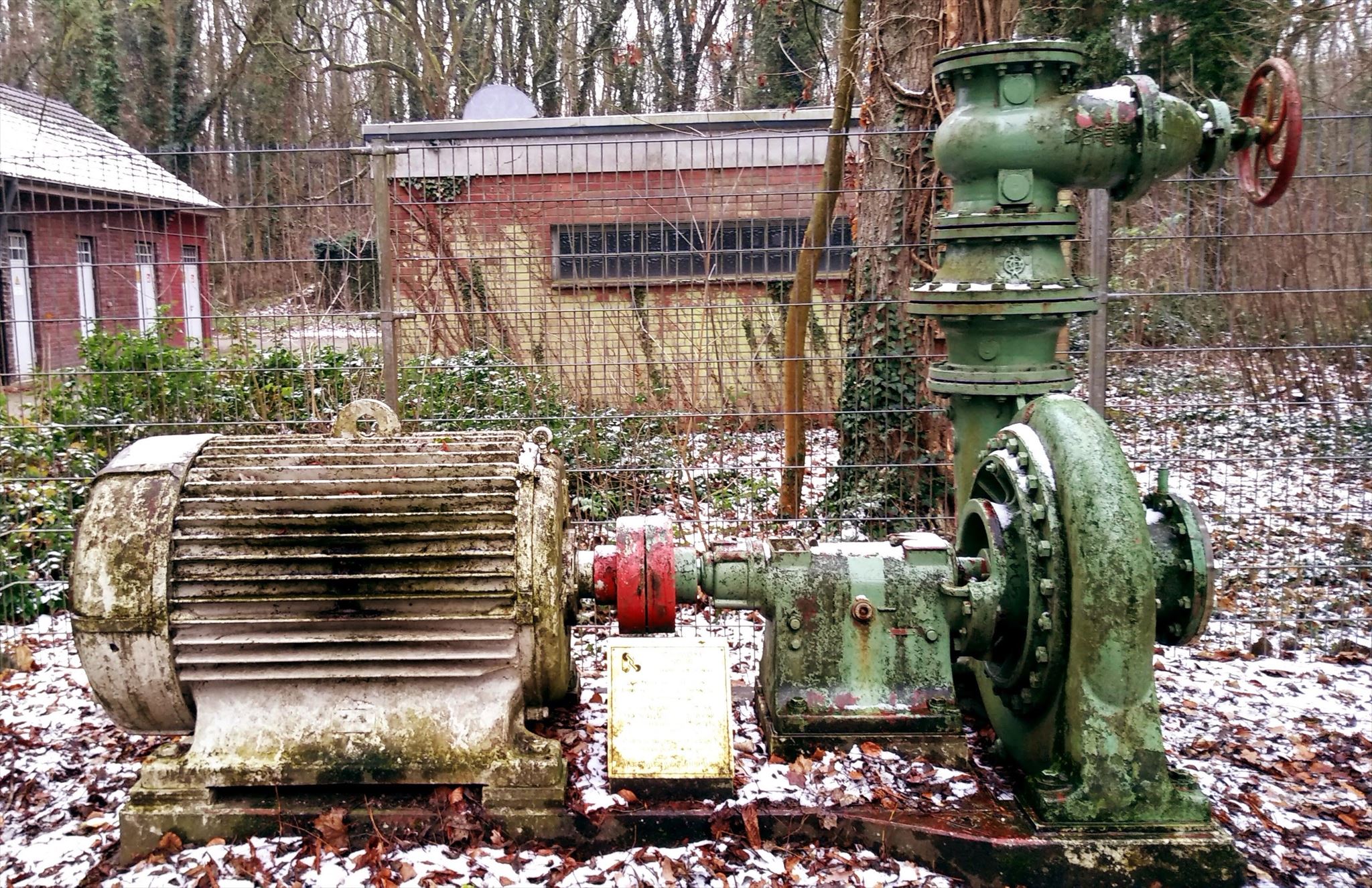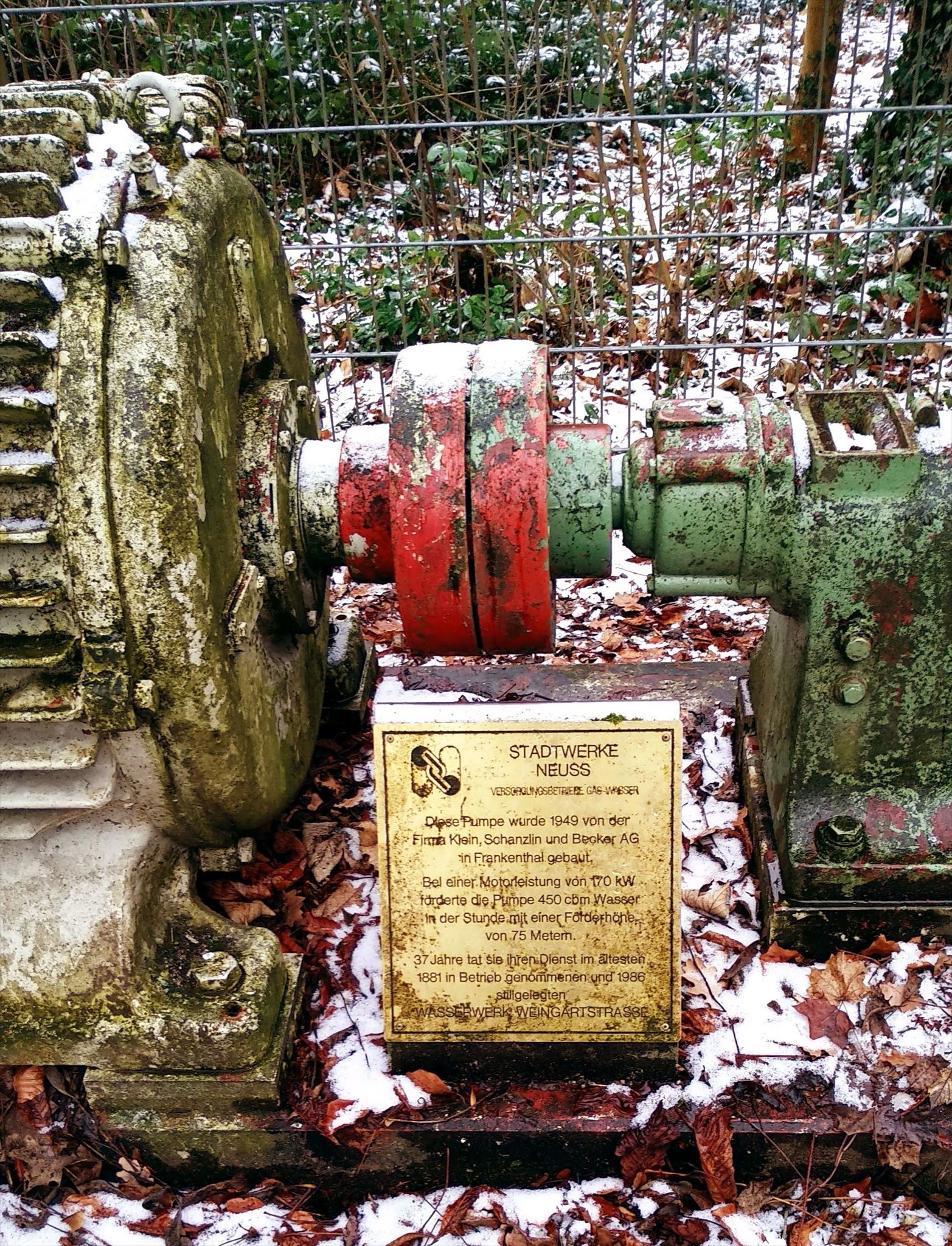 Am Wasserwerk vor der Umzäunung steht diese Wasserpumpe aus dem Jahr 1949, die bis 1986 im Wasserwerk an der Weingartstraße ihren Dienst tat.