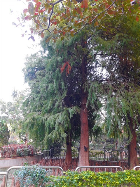 There are three valuable bald cypress trees in the park. Bald cypress famously has these odd structures (cypress knees) that stick out above the water line. Bald cypress has upright trunk, tree shaped like a Christmas tree. Its leaves, like pinnate, branches out from two sides of the twigs in fine linear arrangement. Come and appreciate the beauty of the trees and the peace of the park.