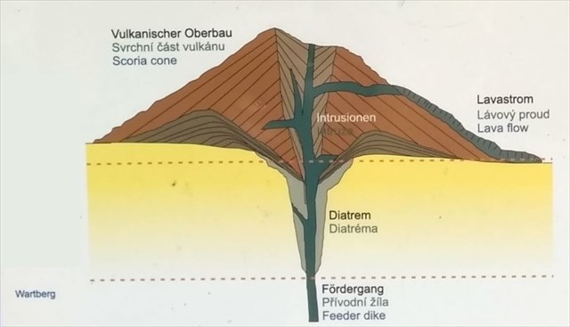 Als Fördergang zu einem längst verschwundenen Vulkan ist der Basalt vor 20 Millionen Jahren auf seinem Weg zum Vulkan in den Granit eingedrungen.Der Wartberg ist ein erosiv freigelegtes unexplosives tieferes Stockwerk unterhalb eines ehemaligen Vulkans.