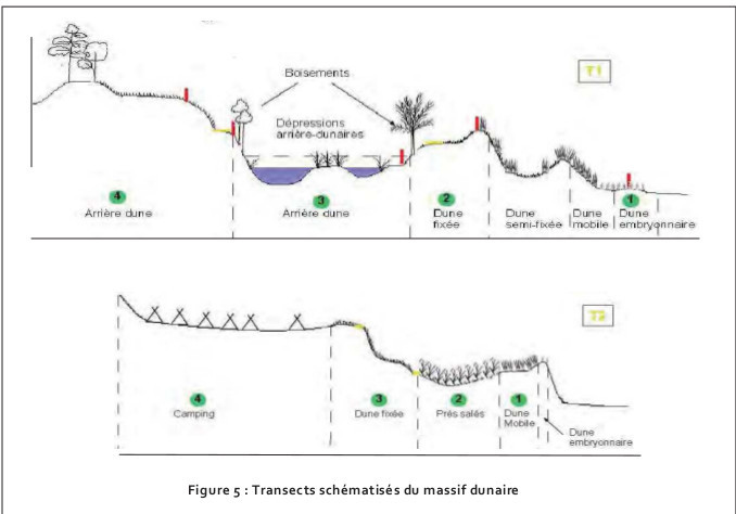 From the beach inland, there are landscape units in bands more or less parallel to the coast and forming the dune complex. Each ecological unit is characterized by a characteristic form and vegetation :