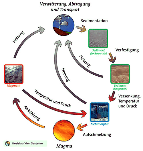 Die drei grundsätzlichen Gesteinstypen der Erde, Sedimentgesteine sowie metamorphe und magmatische Gesteine werden durch geodynamische Prozesse in einem fortwährenden Kreislauf immer wieder ineinander umgewandelt. Alle drei Gesteinstypen sind an der Erdoberfläche zu finden, wo sie der Verwitterung ausgesetzt sind (ganz oben). Als Folge entstehen nach Abtragung, Transport und Sedimentation zunächst Lockergesteine wie etwa Sande. Durch Versenkung und Verfestigung bei relativ niedrigen Temperaturen und Drucken entstehen daraus Sedimentgesteine. Gelangen die Gesteine noch tiefer und sind dabei erhöhten Drucken und Temperaturen ausgesetzt, so entstehen metamorphe Gesteine oder Metamorphite. Weitere Versenkung kann gar zur vollständigen Aufschmelzung des Gesteins führen. Aus flüssigem Magma (unten) entstehen bei Abkühlung magmatische Gesteine. Werden solche magmatischen Gesteine wieder versenkt, können auch aus ihnen metamorphe Gesteine entstehen. Hebungsprozesse (graue Pfeile im Zentrum und oben links) bringen die unterschiedlichen Gesteinstypen an die Erdoberfläche. Der Kreislauf beginnt von neuem. Die auf der Bremer GeoTour vorgestellten Gesteine sind gemäß dieser Grafik farblich als Sediment (grün), Magmatit (rot) oder Metamorphit (blau) gekennzeichnet.