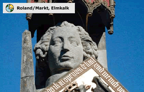 Als Start haben wir den Roland als unseren ersten virtuellen Punkt auserkoren. Für den Bau dieses Symbols der städtischen Freiheit Bremens wurde ein kulturhistorisch bedeutsames Gestein aus dem höheren Teil des Unteren Muschelkalkes verwendet, welches seit fast 1.000 Jahren in zahlreichen Steinbrüchen im Elm nahe Königslutter als Werkstein für Bau- und Kunstwerke abgebaut wurde. Heute ist nur noch ein Steinbruch in Betrieb, der vor allem für Restaurationszwecke abgebaut wird. Das für den Roland benutzte Gestein wird als Oolith bezeichnet, welches aus etwa 1 mm großen kugeligen Kalkausscheidungen, so genannten Ooiden, besteht. Diese zeigen einen konzentrisch schaligen Aufbau, wobei die Kalkhüllen meist einen Kern, ein Sandkorn oder ähnliches umschließen. Ooide bilden sich heute auf der Bahama-Bank in sehr flachem, bewegtem Wasser der Gezeitenzone unter tropischen Klimabedingungen. Die aus dem Wasser durch chemische Übersättigung ausgeschiedenen Karbonatkörner werden durch die starke Wasserbewegung ständig in Bewegung gehalten. Sobald sie eine bestimmte Partikelgröße überschritten haben, sinken sie zu Boden und werden Bestandteile des Sedimentes, das praktisch nur aus solchen Körnern zusammengesetzt ist. Die Gesteine zeigen häufig – wie auch im Kopf des Rolands gut zu sehen – schräg geschichtete Lagen von leicht unterschiedlicher Beschaffenheit. Sie sind als Schrägschichtungskörper zu deuten, die sich durch ständigen Sedimenttransport in einer Barre im Vorstrandbereich gebildet haben. Die spätere Verfestigung des Gesteins erfolgte durch feinsten Karbonatschlamm und die Zementbildung mit dem Mineral Calcit.