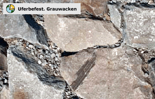 Die Steine der Befestigung am Ufer kann man als schmutzige Sandsteine beschreiben, die zu einem überwiegenden Teil aus Quarzkörnern, aber auch zu einem bestimmten Teil aus Feldspäten und einzelnen kleinen Gesteins bruchstücken anderer Gesteine bestehen, die in eine dunkle tonige Matrix eingebettet sind. Wesentliche Merkmale dieses Gesteins sind seine große Festigkeit und Härte, die durch ein quarzitisches Bindemittel erzeugt werden. Die Zusammensetzung und Sortierung des Gesteins zeigt, dass die Mineralkomponenten nicht weit transportiert und dann schnell abgelagert wurden. Im Harz und Rheinischen Schiefergebirge sind diese Gesteine sehr weit verbreitet.