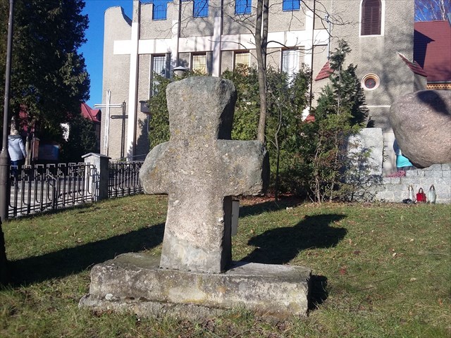 Krzyż kamienny znajduje się na skarpie przed kościołem p.w. św. Marcina, po prawej stronie od wejścia na teren przykościelny. W 1987 r. został umieszczony na cokole, wcześniej znajdował się w murze cmentarza przykościelnego. Krzyż o wymiarach 96 x 69 x 23 cm wykonany jest z piaskowca. Ten relikt średniowiecznego prawa wykonany z miejscowego surowca stoi w miejscu, w którym dokonano zbrodni. Krzyż ten prawdopodobnie został wykonany przez kawalerzystów w 1654 r. W ten sposób wyrazili oni skruchę za zamordowanie tutejszego pastora.