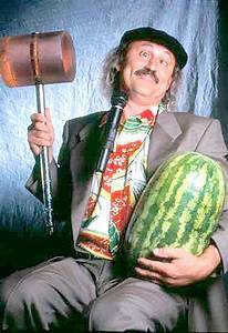 Now, what would it take to push the nucleus over the edge to break it apart? How about hitting it? That would be similar to the comedian Gallagher Sledge-O-Matic routine on a watermelon. Think of the watermelon as the atom and the Sledge-O-Matic as an incident particle. When it hits the watermelon, it goes right through the rind (electron cloud) and busts the watermelon into pieces (fission fragments) sending water (gamma rays), melon (neutrons), white seeds (beta particles) and black seeds (alpha particles) in all directions. Keep in mind you still need to have a sufficient swing (kinetic energy) of the Sledge-O-Matic to break open the watermelon. Likewise, you have to have a particle with sufficient kinetic energy to overcome the binding energy of the nucleus to split it.