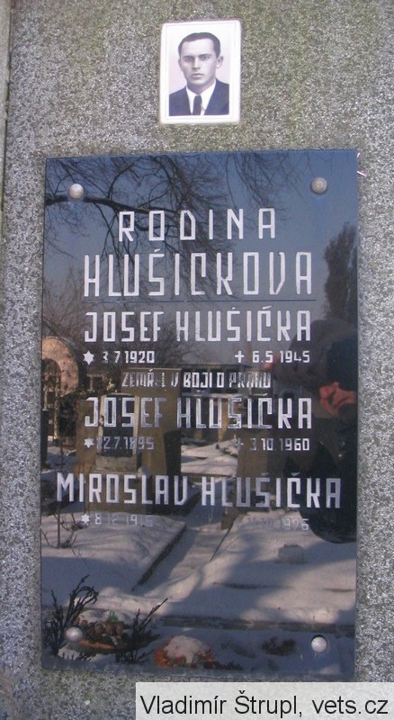 Opět v zadní části hřbitova se nachází hrob, který je vojenským pietním místem. Odpočívá zde Josef Hlušička, který zemřel v boji o Prahu. Přímo naproti tomuto hrobu se nachází rodinná hrobka, kde v předposledním písmenu názvu rodiny nalezneme dle klíče indicii D. Dosaďte dle přiloženého klíče.