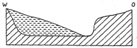 1b. Kijkend in de lengterichting van het dal, zie je wellicht al iets van de asymmetrische vorm van het dal. Misschien zie je niet direct een groot verschil tussen de twee hellingen, maar toch zou je hier wel kunnen bepalen welke oriëntatierichting de hellingen hebben, maar op welke manier?