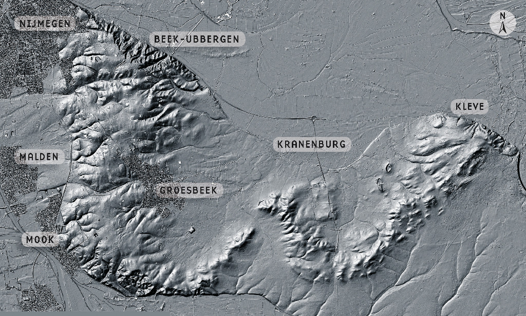 Tijdens de voorlaatste ijstijd, gedurende het Saalien tijdvak, zijn in het grensgebied van Noord-Limburg, Gelderland en net over de Duitse grens stuwwallen gevormd door gletsjertongen komende vanuit Scandinavië. Deze gletsjertongen hebben door hun immense gewicht en kracht de bevroren bodem voor zich tientallen tot soms wel honderd meter omhoog gestuwd. De afbeelding hiernaast laat een duidelijk reliëf zien van het gevormde heuvellandschap rondom Nijmegen en Kleve. Tijdens de laatste ijstijd, in het Weichselien tijdvak, kwam het landijs niet meer tot