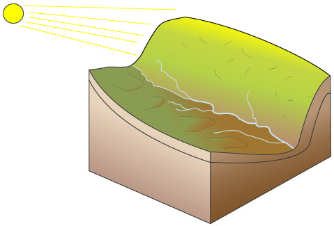 | Droge dalen hebben vaak een asymmetrische doorsnede. Welke kant van het droog dal steil is en welke kant vlakker, is afhankelijk van de oriëntatierichting van het dal ten opzichte van de zon. Wanneer een droog dal van oost naar west loopt, ligt de noordkant van het dal het grootste deel van de dag in de zon en de zuidkant bijna niet. Tijdens de zomermaanden wordt de deels ontdooide, drassige grond, op de noordkant opgedroogd door de warmte van de zon die het grootste deel van de dag tegen de noordkant schijnt. Op de zuidkant wordt de met smeltwater verzadigde grond meegevoerd met |