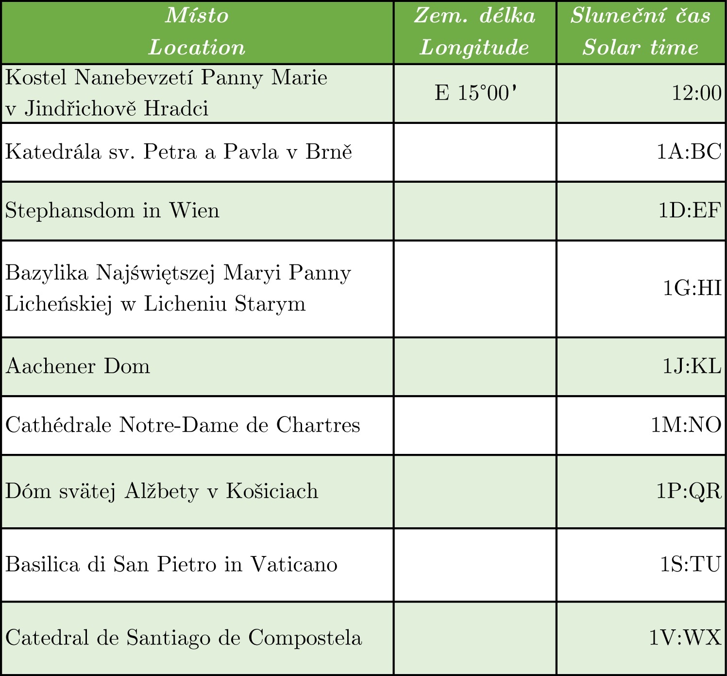 Virtuálně či fyzicky navštivte několik evropských svatostánků v době, kdy místní hodiny odbíjejí poledne. Na základě jejich zeměpisné délky spočítejte odchylku místního slunečního času od SEČ a dosaďte do proměnných.