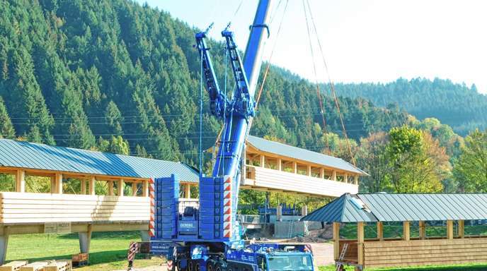 Die ganze Brücke besteht aus 3 Einzelteilen, die mit einem riesigen Kran unter den Augen vieler Schaulustiger eingesetzt wurden.
