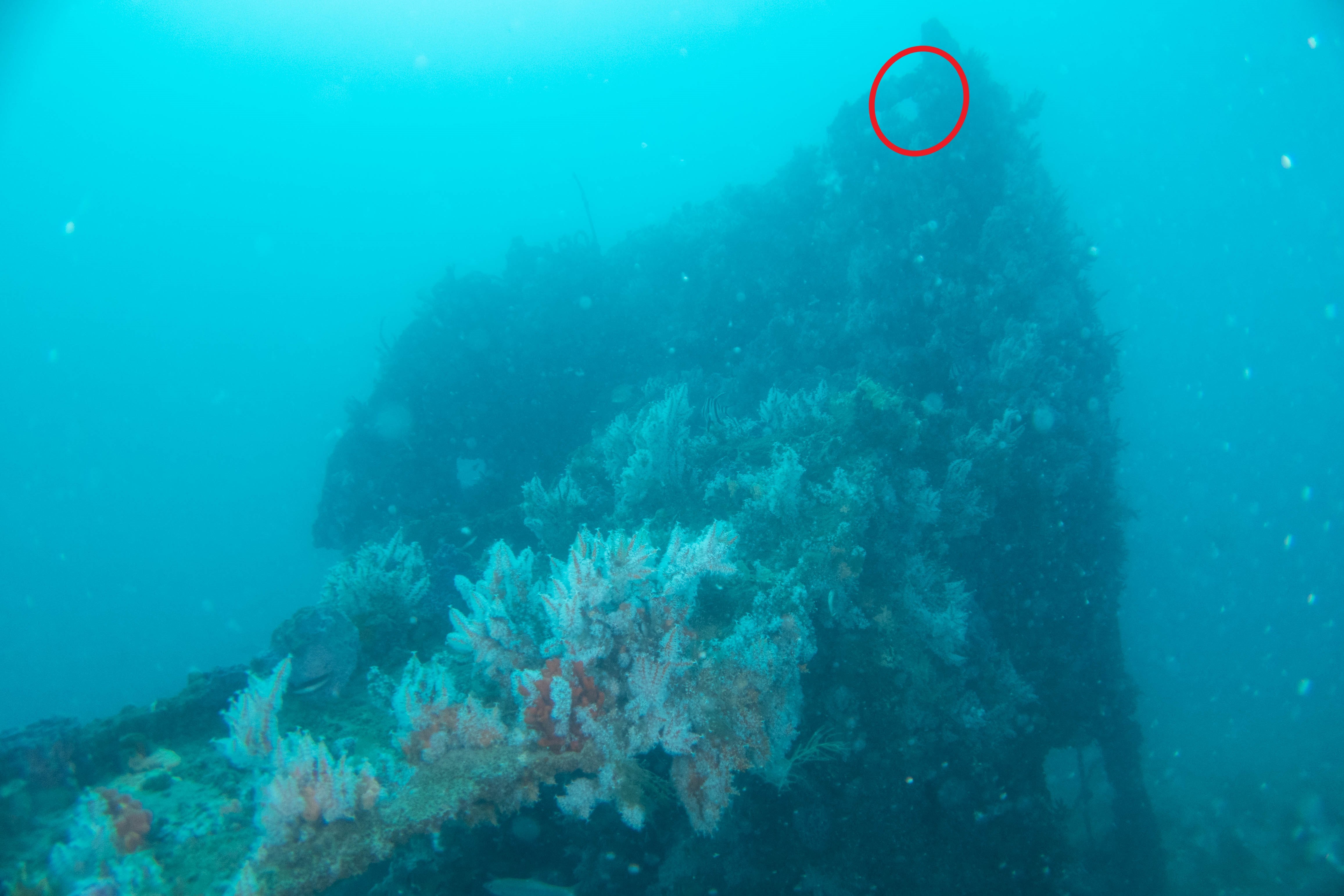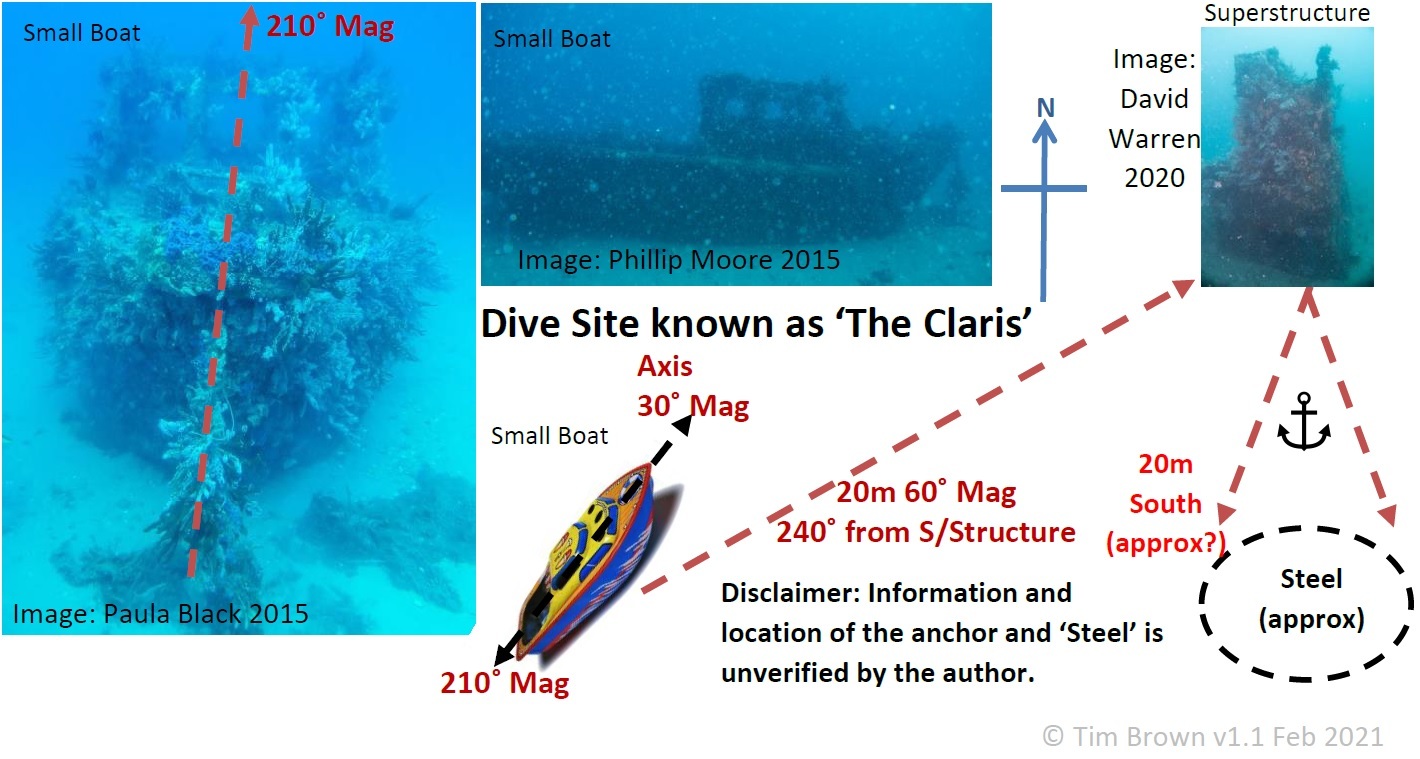 The story behind the Claris is a bit of a mystery as two small vessels lie close to each other at a water depth of approximately 25 m. The smaller, less intact vessel is widely considered to be the Claris – mostly a field of debris – while the other wreck appears to be a half cabin cruiser. This unknown vessel is around 25 m to the west of the Claris linked by a star picket trail, and just covered in the Carijoa (genus) soft corals that look like starry white christmas trees. There is also a rumoured third area of steel nearby.
