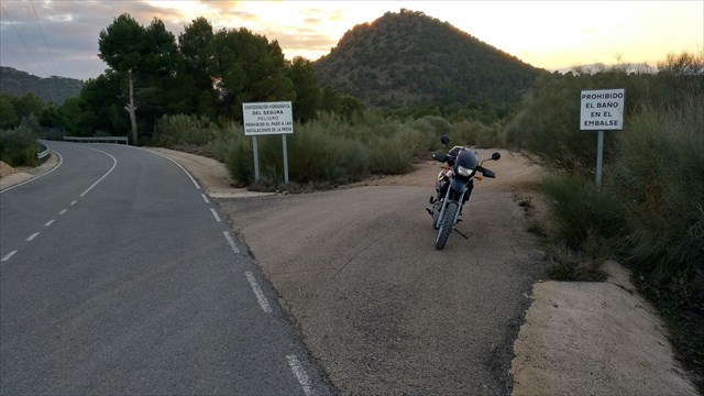 En esta foto donde aparece la geomoto se coge el camino que sale hacia la presa desde la carretera (algo mas adelante esta cerrada por una puerta metálica y por ese lugar no es posible el acceso), como no sabia si se podría llegar hasta la presa, cuando iba buscando un lugar donde aparcar me encontré con dos personas y les pregunte si era posible acceder y me dijeron que si, que ellos recorren ese camino con frecuencia para llegar a un lugar de su propiedad, y efectivamente siguiendo el camino llegas a la presa en un paseo; evidentemente esto es cuando la presa está sin agua, si alguna vez esta llena lo normal es que los caminos no estén disponibles, pero a la vista de la vegetación de los alrededores no creo que ocurra muy a menudo, ya que su principal función está encarada al control de las avenidas en circunstancias ocasionales por fuertes precipitaciones.