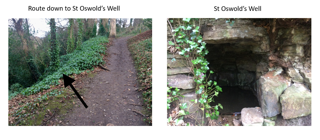Similarly forgotten is the well behind the river path at the back of St Oswaldâs Church. St Oswaldâs Well was once a site of beautiful arches and basins. Unfortunately, these were destroyed by vandals in the 19th century, although what remains today is still impressive. The well consists of a large cavern hewn into a sandstone outcrop part-way down the steep banks of the River Wear. It is roughly three metres deep and one-and-a-half metres wide and high. The cavern is filled with water which flows out down the slopes to the Wear. Access is extremely precarious as one must go off the footpath to descend the steep river bank in order to view it.
