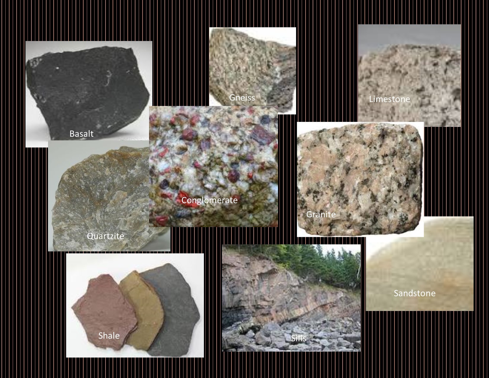 11. Sills: a tabular sheet intrusion that has intruded between older layers of sedimentary rock, beds of volcanic lava or tuff, or along the direction of foliation in metamorphic rock.