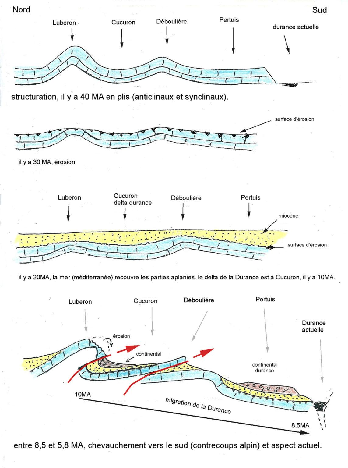 Les 4 coupes schématiques ci-dessous [2] décrivent la formation du massif du Luberon, de - 40 million d'années à aujourd'hui. Par le jeu des plis, érosions, montées et baisse des niveaux des mers, une couche correspondant à des élèments du Miocène s'est retrouvée en surface. Le Miocène est un age où une mer chaude se trouvait au dessus de la région, il y a donc pu avoir des dépots de sediments marins contenant des debris d'organismes vivant dans ces couches. Ces couches solidifiées de roche sédimentaire sont dans certains endroits exploitées pour extraire des pierres de construction.