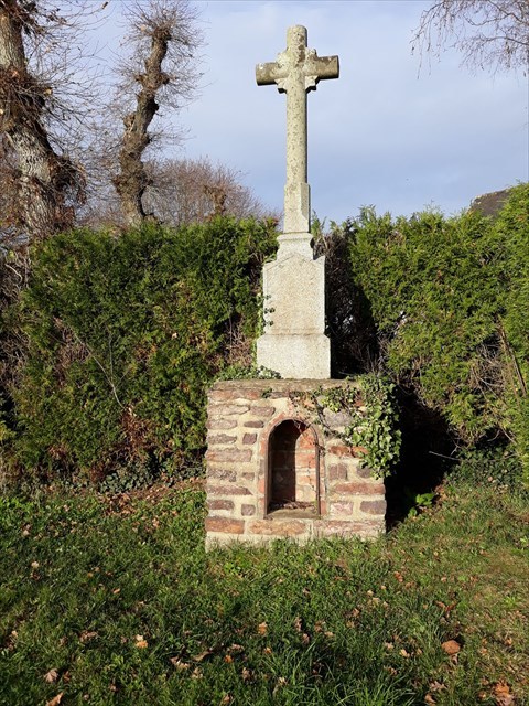 La croix de cimetière datée de 1882, était à l'origine implantée sur la place du centre, mais fut intégrée au cimetière suite au déplacement de ce dernier dans les années 1970 au nord ouest de la commune. Au cours de ce déplacement, une croix monumentale déjà présente dans le cimetière primitif qui entourait l'église a disparu. Elle présentait un socle en granite avec un décor sculpté.