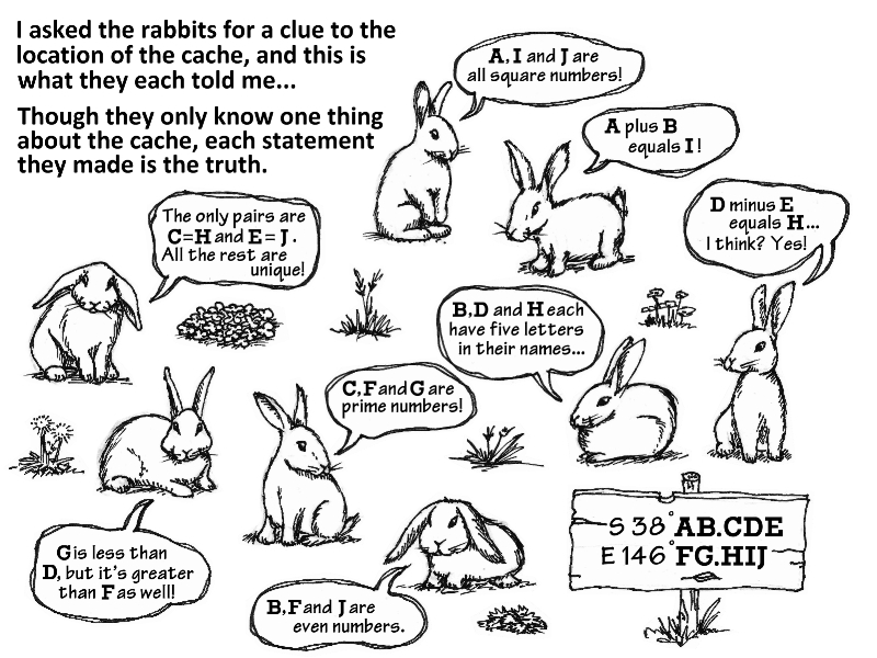 They led me to a wooden sign with the coordinates painted on it, but written in code. The rabbits explained that they knew the answer to the code, but they couldn't... quite... remember what it was. I couldn't tell if they were being honest, but figured that since they were only rabbits, what need did they have to remember everything about a cache they had little use for?