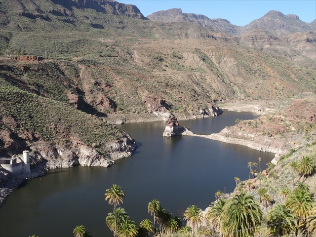 Esta Presa de Tirajana, también conocida como Presa de la Sorrueda, se finalizó en 1974, siendo de las escasas en Gran Canaria construida con materiales sueltos: se trata de una fábrica en escollera con núcleo de arcilla, cuya altura máxima desde cimientos es de 74 m., con una capacidad para 380.000 m3. En ella destaca su peculiar aliviadero, en túnel, circular y carente de compuertas,, conocido por Morning Glory (nombre inglés para algunas Ipomoea ornamentales, plantas emparentadas con la batata y que, como ésta, tiene características flores en forma de trompeta o embudo).