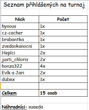 Při přihlašování prosím napište, zda máte zájem o samotný turnaj, kolik osob se bude účastnit, popřípadě zda přijdete jen "fandit". Při 16 přihlášeném hráči udělám STOP STAV a muhou se hlásit ještě náhradníci. Přihlášení je závazné!! (Jestliže se nakonec třeba neúčastníte, odhlašte se prosím za včasu...Přece jen se bude jednat o menší turnaj a je potřeba aby se nás sešlo opravdu 16)