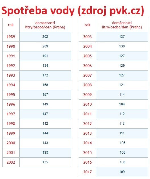 Průměrná roční spotřeba pitné vody na obyvatele Prahy v roce 2017 (v kategorii domácnosti, bez ostatních odběratelů) byla dle (www.pvk.cz) 40 m3 .Data za rok 2018 ještě nejsou na webu dostupná.