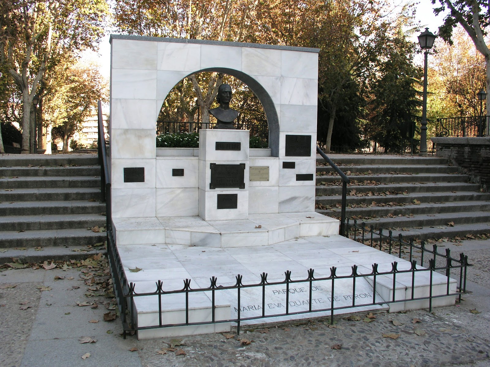 Fuente circular. Esta fuente pertenece al diseño original del parque, que sigue un esquema clásico de recuadros y ejes bordeados de setos, con una traza cruciforme dominada por un eje longitudinal con dos fuentes, y otro transversal con el monumento a Eva Perón. Se iniciaron las obras en los años cincuenta, pudiéndose apreciar ya la traza del parque en el plano de Madrid de 1955.