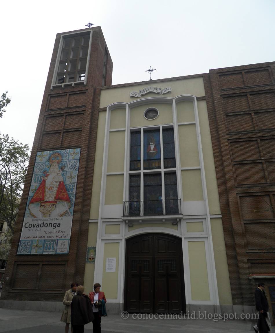 En el altar mayor se venera a la Virgen de Covadonga. Esta imagen procede del histórico convento de San Plácido.