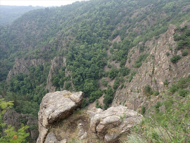 Von der Roßtrappe erschließt sich ein Ausblick auf die Felsen des Hexentanzplatzes, die „Steinerne Kirche“, ins Bodetal und Harzvorland mit der Stadt Thale sowie zum Brocken.