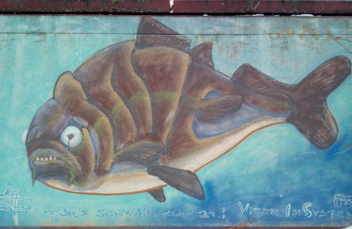Das gesuchte Bauwerk auf diesem Graffiti ist für jedermann frei zugänglich, man kann sogar mit dem Auto daran vorbei fahren. Finde das Graffiti und stelle dich dann genau vor das Gebilde und peile: