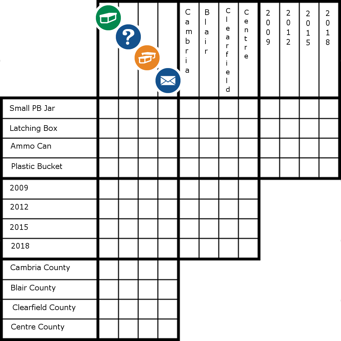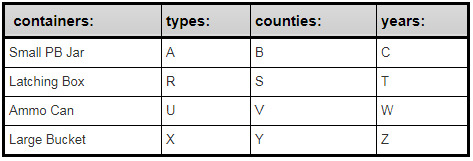 Using the following clues, you must discover which hypothetical cache goes with which container, cache type, location/county, and hide year. This will lead you (eventually) to the final coordinates to the actual, real-world hidden cache after working through all the steps of this puzzle.