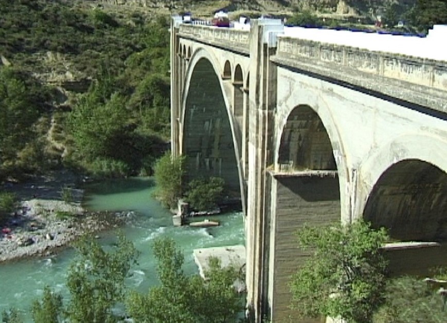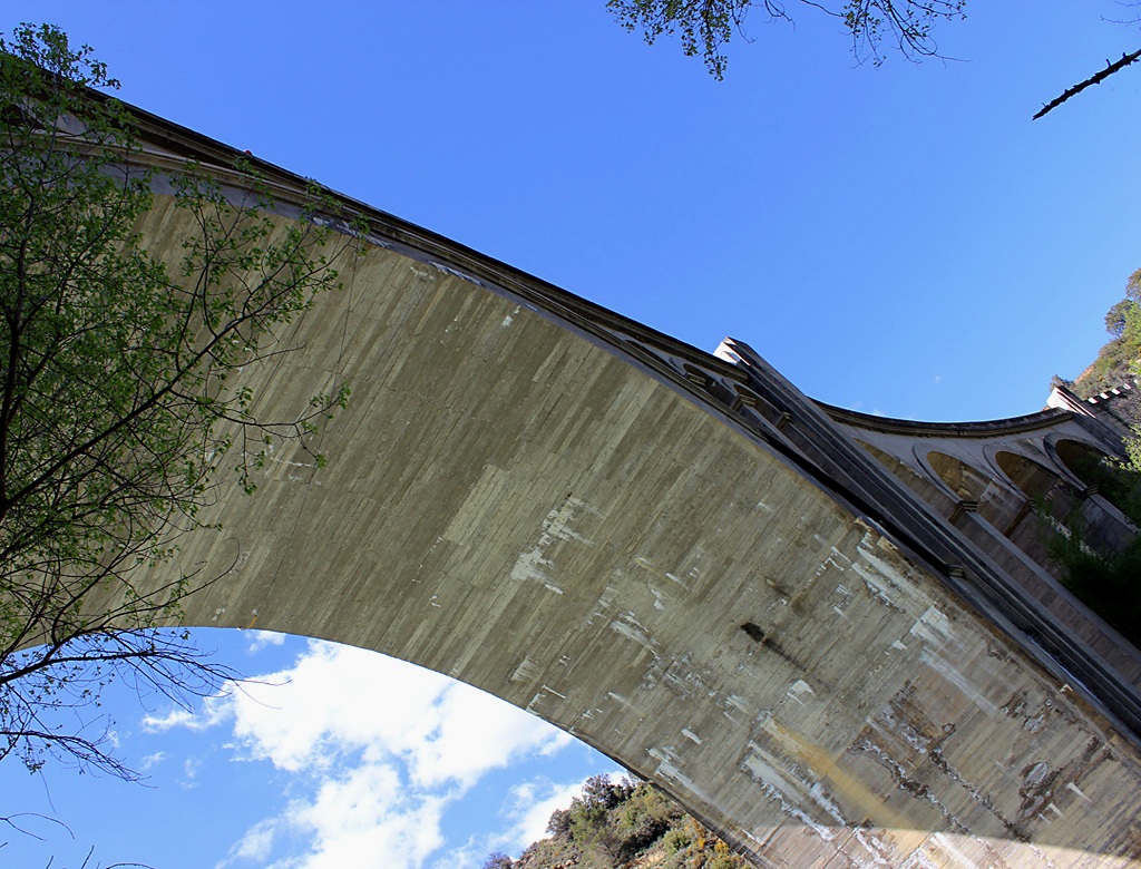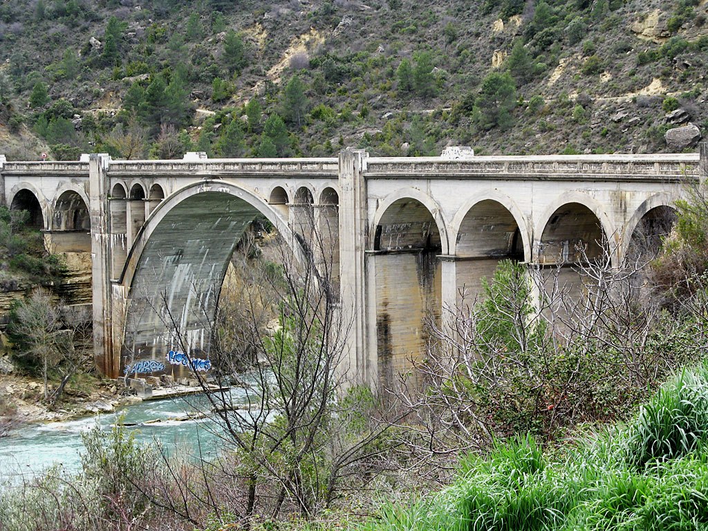 Cuando circulaba por la legendaria N-240, pues este tramo actual de la carretera autonómica era nacional hace años, llegué a este puente con intención de fotografiar el espectacular puente de fábrica en ruina y paré, claro que paré. Al final, me fijaba más en este puente de hormigón que en el otro y hoy, escribo de ambos. Aunque es obra de aproximadamente 1.943 o 1.944 me recuerda mucho a los viaductos ferroviarios que diseñó José Roselló Martí para la fallida línea de Alicante-Alcoy allá por el año 1.929. También tiene aires del viaducto de Sant Joan de les Abadesses sobre el río Ter. En fin, quizás es una estructura muy generalizada hasta los años 60 por el Ministerio de Fomento para salvar cauces relativamente estrechos pero con gran profundidad.