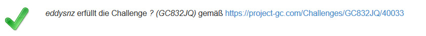 Bitte verwende den folgenden Challenge-Checker, um Deine Qualifikationen zu überprüfen. Wenn Du Dich derzeit nicht qualifizierst, kannst Du das Logbuch jederzeit unterschreiben und eine Notiz auf der Cache-Seite veröffentlichen. Sobald Du die Bedingung erfüllst kannst Du deine Write Note in ein Log umwandeln.