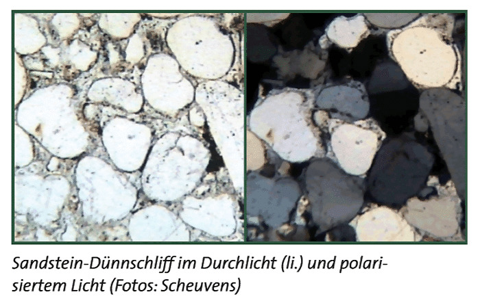 Sandstein gehört zu den Ablagerungsgesteinen (Sedimentgesteine) und besteht aus Quarzkörnern mit unterschiedlichen Beimengungen von Feldspat, Gesteinsbruchstücken und Schwermineralen. Die Bindung der Sandkörner kann durch Quarz, Ton oder Karbonate erfolgen. Von der Art der Zementation hängt die Widerstandsfähigkeit des Sandsteins gegenüber Verwitterung ab. Es handelt sich hier um einen quarzgebundenen Sandstein mit unterschiedlich gefärbten Lagen, die weiß-rot-gestreift oder gleichmäßig rot eingefärbt sein können. In ihm kommen sowohl grobe als auch feine Quarzkörner vor. Die Druckfestigkeit liegt zwischen 700 und 1000 kg/cm². Das Gestein ist ein plattiger bis dickbankiger Sandstein, fein- bis mittelkörnig, braunrot bis blaßrot, hellgrau gestreift. Schräg- und Kreuzschichtung. Eingeschaltet sind rotbraune, bis 0,60 Meter mächtige Tonsteinlagen. Braunrote Tongallen und Lockersandnester.
