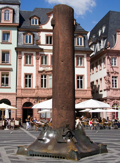 In der Mitte des Marktes hier in Mainz ragt die Heunensäule empor. Die über 1000 Jahre alte Heunensäule wurde 1975 aus Anlass des 1000jährigen Domjubiläums auf dem Markt aufgestellt. Sie wiegt 16 Tonnen, ist 6,40 Meter hoch und hat einen Durchmesser von 1,20 Meter. Der Begriff Heunen wird nicht nur mit den Heunen/Hunen der Thidrekssaga und des Nibelungenliedes verbunden, sondern auch mit einigen römerzeitlichen Resten. So gibt es Hünen- und Hühnerstraßen, welche Römerstraßen waren, auch römische Siedlungen werden in ein paar Fällen mit der Silbe Hün- oder Heun- bezeichnet.