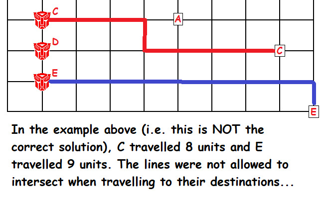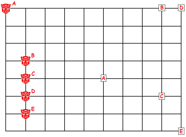 Here is the picture that was shown to the Autobots, showing the grid, their start positions, and their destinations:
