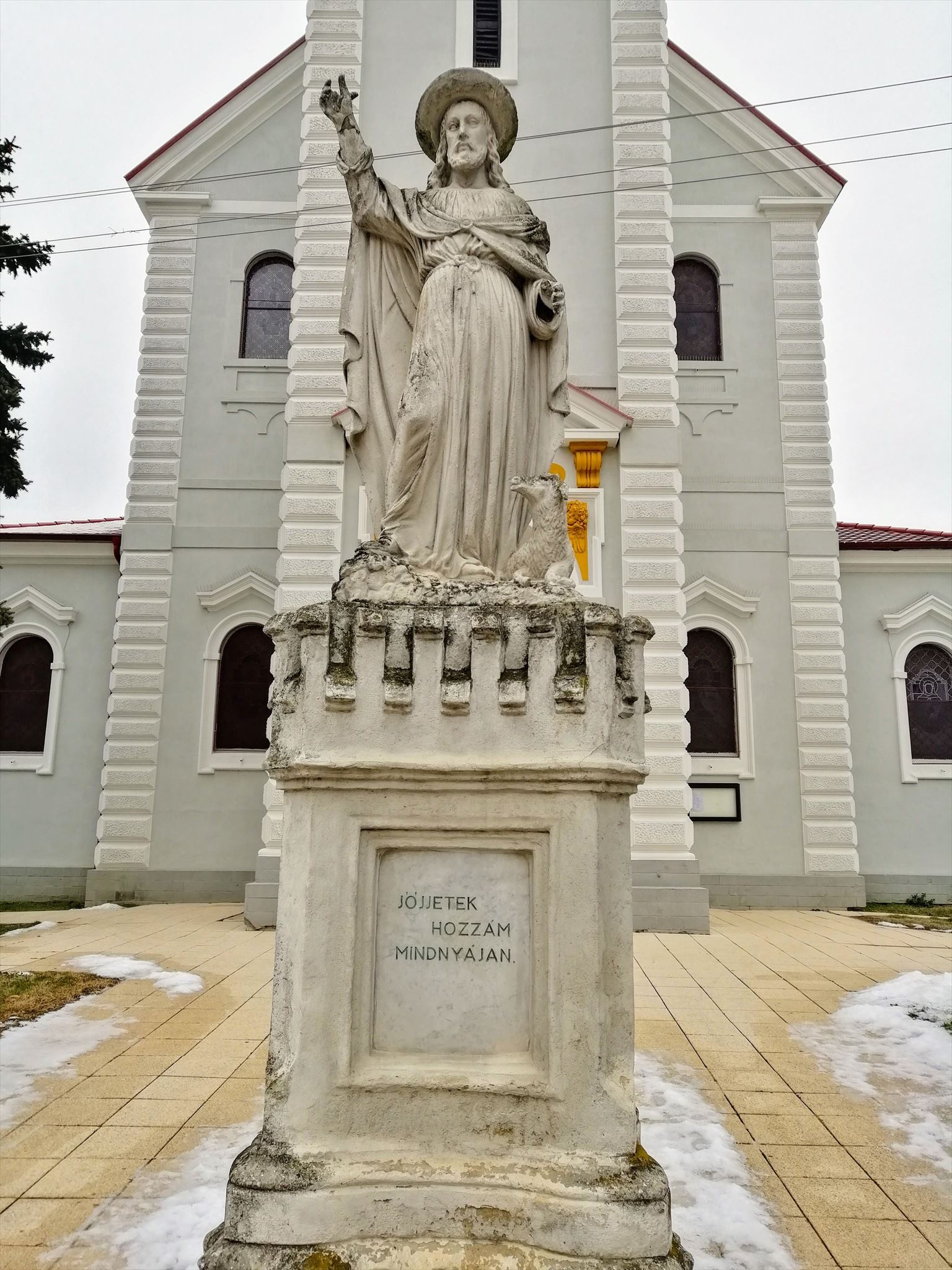 Szűz Mária szobrával . A templom előtt Szent Vendel jó pásztor szobra áll , a szobor talpazatán az alábbi felirat olvasható :