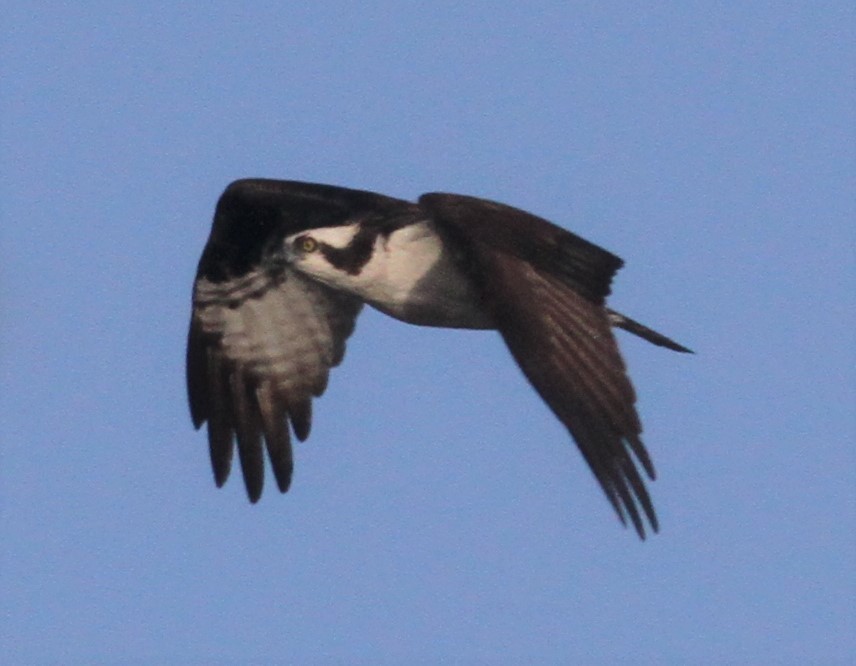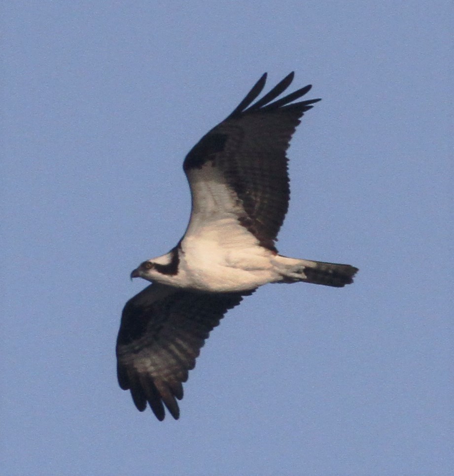 The Osprey can be seen occasionally looking for a meal here. From eBird, the Osprey is a large, mostly white raptor that cruises over lakes, rivers, and coastal waterways in search of fish. Impressively widespread: found on every continent except Antarctica. Mostly white head and underparts; dark brown back. In flight, holds wings with a kink in the wrist (shaped like an "M"). Stick nests are conspicuous on top of channel markers, utility poles and high platforms near water. Often seen plunging feet-first into water from high in the air to grab fish.
