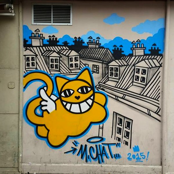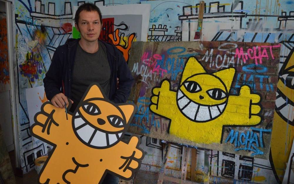 C'est en effet de l'effigie du street artist M.CHAT que l'on parle ici. De son vrai nom Thoma Vuille, l'artiste franco-suisse tapisse les murs depuis 1997 avec son félin au sourire béant. Né en 1972 en Suisse, dans le Canton de Neuchâtel, il commence la peinture dès l'âge de 15 ans et étudie à l'Institut des Arts Visuels d'Orléans de 1995 à 2001, mais va très vite y préférer les allées de la ville pour créer.