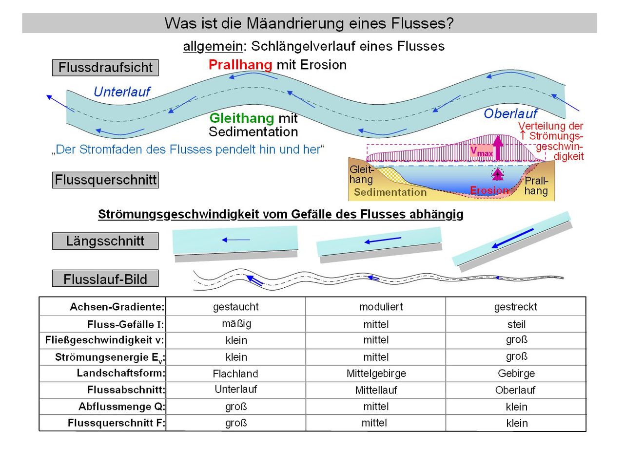 1.) Schaue dir den Bachlauf hier einmal genau an. Beschreibe den Unterschied der jeweiligen Innenseite und Außenseite und benenne sie mit dem entsprechenden Fachbegriff.