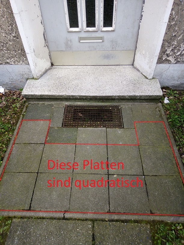 Vor dem Eingang liegt ein rostiges Gitter mit AxB Löchern. Dieses Gitter ist von C quadratischen (!) Platten umgeben. Auf der Klingeltafel sind D Parteien aufgelistet, und der Wortwert des Herstellers dieser Tafel ist E=48.