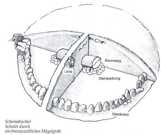 Ihr steht vor dem größten Hügelgräberfeld im Heilachwald - einer kleinen Nekropole, oder Totenstadt. Jeder Hügel erinnert an einen verstorbenen keltischen Adeligen oder Gutsbesitzer. Die 'einfachen Leute' wurden oft in Brandgräbern zwischen den Hügelgräbern bestattet. Die Grabkammer und der darüber aufgeworfene Erdhügel stellten das Totenhaus für eine zukünftige Bleibe des Verstorbenen dar. Oft bezeichnete ein Steinkranz um den Hügel den festen Bezirk des Toten. In der frühen Hallstattzeit (800-620 vor Christus; der Name stammt vom ersten Fundort dieser Epoche im österreichischen Salzkammergut) wurde die Asche des Verstorbenen in der Grabkammer beerdigt, in der späteren Phase (620-450 v. Chr.) ging man zu Körperbestattungen über. Hier eine schematische Darstellung: