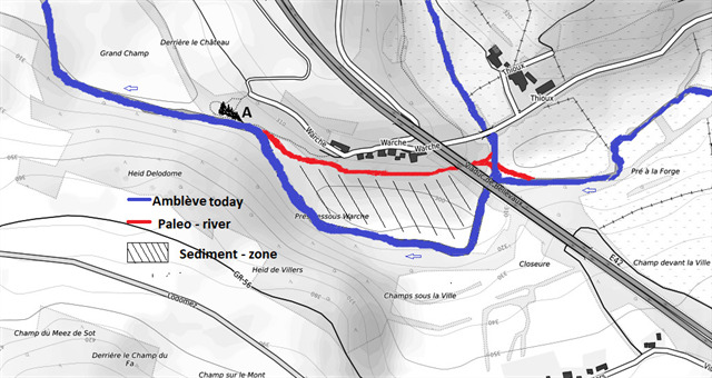 Kenmerk, een palaeokanaal ( rode lijn ) verschild van het afzettingsgebied van de momenteel nog actieve rivier ( blauwe lijn ), in's bijzondere bij waterlopen, dewelke niet hun normaal debiet hebben en waarvan de rivierbedding is gevuld met sedimentaire afzettingen die geen verband houden met de normale rivierbodem en het huidige patroon van de waterloop.